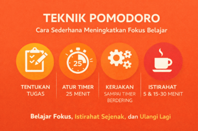 Teknik Pomodoro adalah Metode kerja dengan membagi waktu menjadi 25 menit fokus, diselingi istirahat 5 menit. Setelah 4 siklus, istirahat lebih lama (15-30 menit).Teknik ini pertama kali diperkenalkan oleh Francesco Cirillo. Tehnik ini bisa jadi salah satu cara sederhana tapi efektif untuk membantu siswa belajar lebih fokus dan terstruktur. Intinya, teknik ini membagi waktu belajar menjadi sesi-sesi pendek agar otak tidak cepat lelah dan tetap produktif
