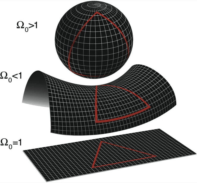 Menurut Einstein, keberadaan materi dan energi dapat memengaruhi kelengkungan ruang dan waktu. Berdasarkan hal itu, bentuk alam semesta secara umum bisa dibagi menjadi tiga kemungkinan besar: