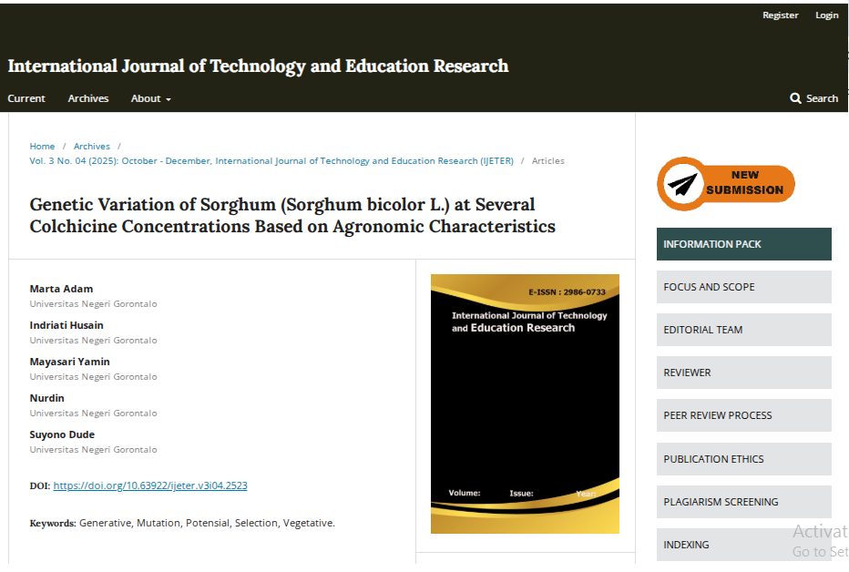 Sorghum (Sorghum bicolor L.) serves as an alternative food source to rice due to its rich nutritional content. The development of sorghum through breeding can be facilitated using colchicine. This study aimed to: (1) identify sorghum varieties exhibiting the best performance based on agronomic traits; (2) determine the effective colchicine treatment for increasing genetic variation in sorghum varieties; (3) identify agronomic traits with high genetic variability influenced by multiple genes; and (4) evaluate the best interaction between colchicine and variety based on sorghum agronomic traits. The study was conducted from January to April 2025 in the Greenhouse of the Agricultural Assembly and Modernization Agency, Gorontalo. The experiment employed a factorial Completely Randomized Design (CRD), where the first factor consisted of two varieties, Numbu and Kawali, and the second factor comprised four colchicine concentrations: 0 ppm, 750 ppm, 1000 ppm, and 1250 ppm. Each treatment was replicated three times, resulting in a total of 24 experimental units. The results indicated that the Numbu variety exhibited the highest genetic variability based on leaf area; a colchicine concentration of 750 ppm effectively enhanced sorghum plant variability; plant height, panicle length, and leaf area displayed high genetic variation and were controlled by multiple genes; and the interaction of the Numbu variety with 750 ppm colchicine showed the most favorable performance based on the selection traits of panicle length, plant height, and leaf area. Therefore, this combination holds potential for the colchicine-based development of sorghum.